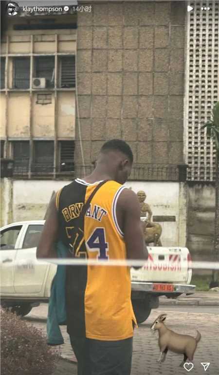 克莱在ins晒出了自己在喀麦隆偶遇球迷身穿科比24号和8号球衣的照片,并配图一只山羊(goat)。