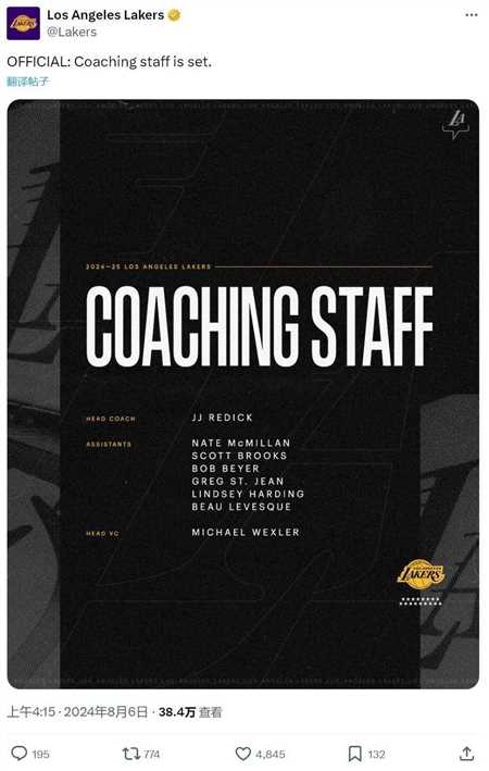 北京时间8月6日上午,湖人官方公布教练团队大名单。主教练:雷迪克。助理教练:内特-麦克米兰、斯科特-布鲁克斯、鲍勃-贝耶、格雷格-圣让、林赛-哈丁、博-勒维斯克。首席录像分析师:迈克尔-韦克斯勒。湖人功勋助教菲尔-汉迪离队。
