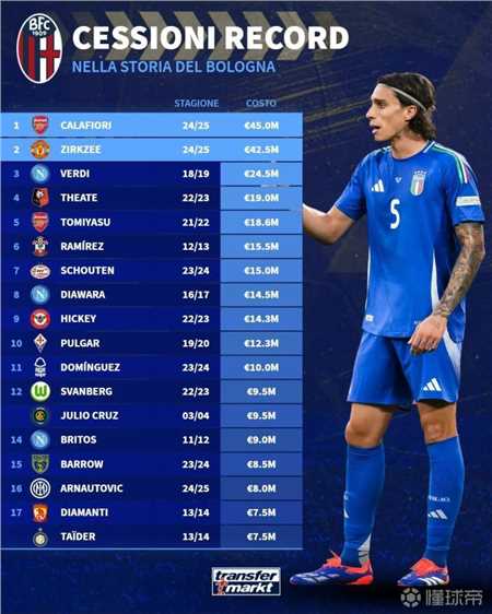此前这一纪录的创造者正是在卡拉菲奥里之前不久才刚刚加盟曼联的荷兰前锋齐尔克泽,他转会曼联的价格为4250万欧元,他和卡拉菲奥里也是博洛尼亚队史上仅有的出售价格超过3000万欧元的球员。