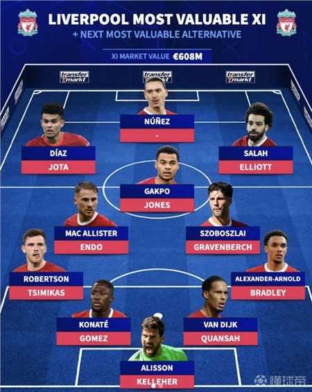 不久前,德国转会市场预测了利物浦在2024/25赛季的首发阵容,并列出了对应位置身价最高的替补球员。
