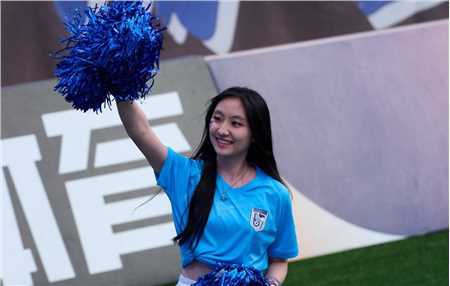 美女啦啦队在北看台最前排为大连英博助威的照片。