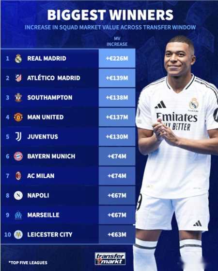 最近,德国转会市场列出了今夏五大联赛俱乐部总身价上涨的排名。其中,皇马总身价上涨2.26亿欧,位列榜首。马竞、南安普顿位列前三。