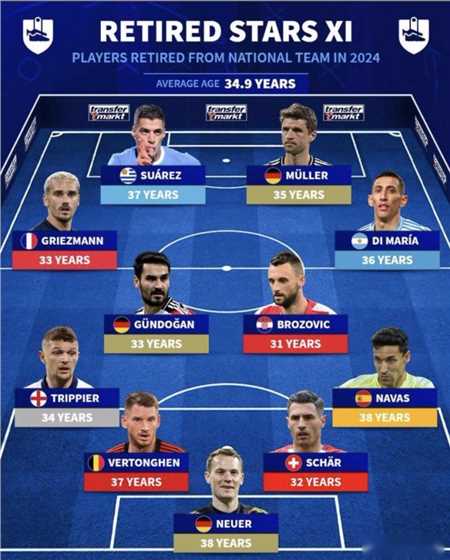 北京时间10月14日,德国转会市场列出了今年从国家队退役的球员阵容。其中,诺伊尔、穆勒、格列兹曼、苏亚雷斯等人在列。