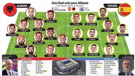西班牙媒体《马卡报》预测了阿尔巴尼亚vs西班牙的首发阵容。