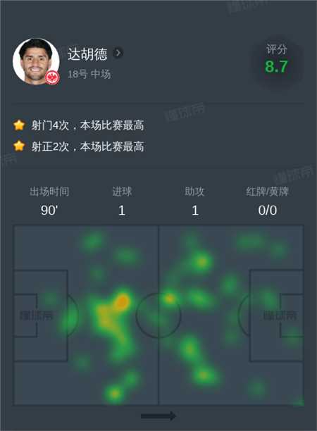 北京时间11月2日法兰克福vs波鸿,达胡德贡献1球,1助攻,2次关键传球,4次射门,1次成功过人。
