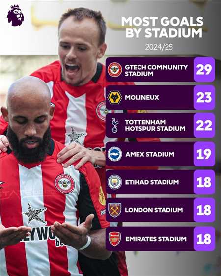 英超官方统计了本赛季至今英超联赛中产生最多进球的球场,布伦特福德的社区球场以29球高居第一,狼队的莫利诺克斯球场以23球排名第三,托特纳姆热刺球场以22球排名第三。