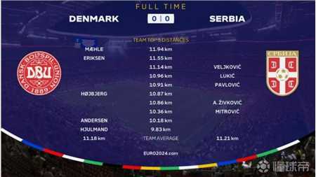 丹麦的左翼卫梅勒和中场埃里克森是本场比赛跑动距离排名前二位的球员,塞尔维亚跑动距离最多的球员则是中后卫维利科维奇。