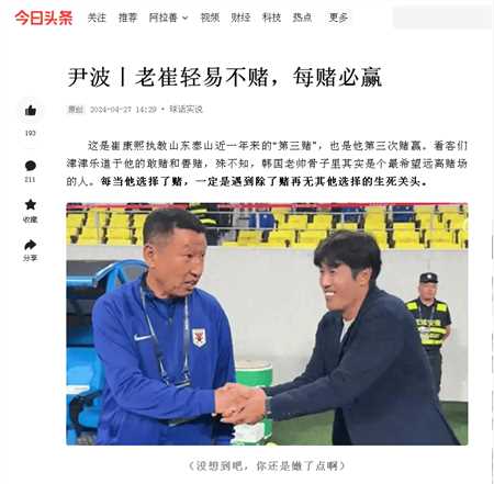 尹姓知名记者在4月27日,也就是本赛季中超联赛第8轮泰山队客场1-0战胜成都蓉城的第二天,以“老崔轻易不赌,每赌必赢”为题写了一篇评论,谈了崔康熙执教泰山队之后,包括此战以“田忌赛马”胜了“韩国教头德比”在内的3次“赌博”(前两次对手均为国安,且泰山队都是伤兵满营之下以弱胜强)。
