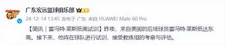 12月14日最新消息,广东宏远官方发布消息:“来自美国的后场球员雷冯特·莱斯抵达东莞,他将在球队进行试训。”