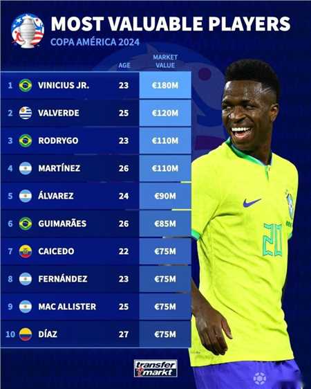 2024年美洲杯即将开打,德国转会市场网站列出了美洲杯参赛球员身价排行榜前十,巴西前锋维尼修斯以1.8亿欧居首,阿根廷4人,巴西3人,乌拉圭、厄瓜多尔、哥伦比亚各1人。