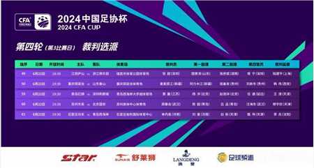 北京时间6月22日,足协杯官方公布了第4轮第3比赛日的裁判员选派名单,麦麦提江执法重庆铜梁龙vs山东泰山,黄翼执法青岛红狮vs深圳新鹏城,顾春含执法苏州东吴vs北京国安。