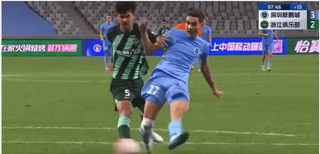 昨晚的第16轮中超联赛,积分榜排名倒数第三的升班马深圳新鹏城在主场迎战上赛季季军浙江。深圳在0:2落后,并未气馁,凭借体能和凶猛的逼抢,连扳两球。比赛第98分钟,拜合拉木再度发挥他抢断能力强的特点,在中圈断球后,通过大步幅变向带球,突入禁区。面对出击门将和包夹的后卫,他巧射远角,破门得分。