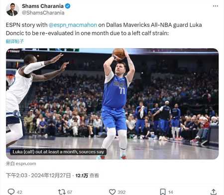 北京时间12月27日下午,nba名记shams报道,东契奇遭遇左小腿拉伤,将在一个月后复查!在独行侠和森林狼的圣诞大战中,比赛第二节,东契奇因伤退赛。未来一个月,独行侠要打16场比赛,东契奇本赛季至今已经缺席8场。