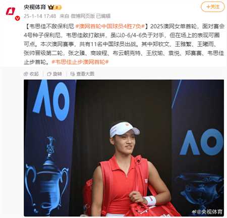 据央视体育微博消息,2025澳网女单首轮,面对赛会4号种子保利尼,韦思佳敢打敢拼,虽以0-6/4-6负于对手,但在场上的表现可圈可点。