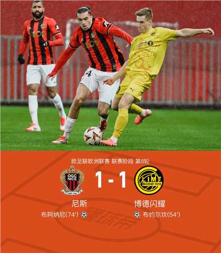 在欧足联欧洲联赛的较量中,尼斯与博德闪耀 了一场激烈的对决。比赛中,博德闪耀的 伊萨克 -梅泰送出精妙助攻,布约尔坎成功破门,为球队取得领先。随后,尼斯的加埃唐-拉博德也不甘示弱,助攻布阿纳尼扳平比分。最终,双方以1-1握手言和,各自收获一分。
