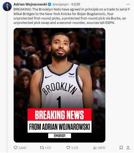 北京时间6月26日上午,一则重磅交易:篮网将“大桥”布里奇斯,和2026年次轮签交易至尼克斯,换来博扬、四个无保护首轮签(2025年、2027年、2029年和2031年)、2025年受保护首轮签(来自雄鹿),2028年首轮互换和2025年次轮签。