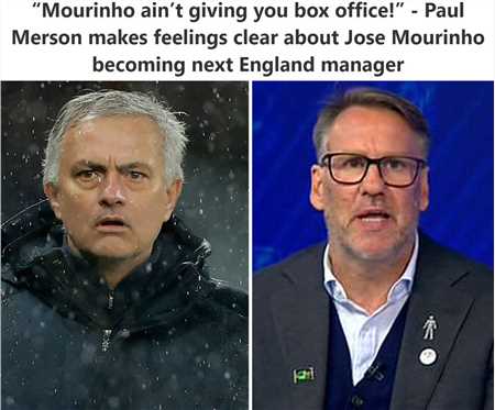 英国媒体镜报报道,阿森纳名宿保罗默森谈到了他对穆里尼奥如果接任英格兰队的看法。默森表示,自己不支持穆里尼奥,因为葡萄牙人的足球没有观赏性,不会带来任何的票房,顶多只能像索斯盖特那样打入决赛。